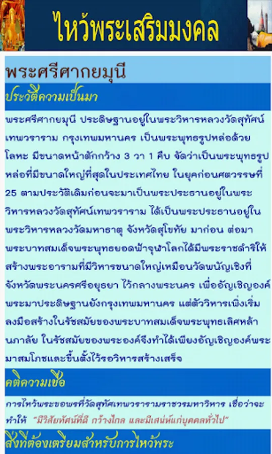 The program brings together the history of the statue of Buddha. And sacred pagoda pagoda is an important and respected the faith of the people of Thailand. Including details of the statue at the temple of worship of any province, according to pray for the realization of a votive offering with anything. How to worship and what to prepare for worship. It also contains information on the belief that the sacred Emerald Buddha, such as the belief that if people have to pray to be made. "Silver and gold glass flowing throughout the year," Luang Pho Wat Palelai. The common belief is that when I go to make obeisance. "Life is but flourished. And a pass even to themselves, "Buddha. People who travel to bow down I have to believe that. "Get ready to experience the good things in life and success in all matters," and those who want to pray in this way, it can bring this information to the consideration of whether to travel to pay respects to pray. Things to do so to fulfill the desire. It also includes information about the time of the festival, or to worship the sacred annual report. To assist in the matter of choosing the right time to travel to worship the sacred meets the critical period because it is more interesting than the usual time to worship Buddha. Is held every year during the sixth night of the 12th lunar month till 3 or around the end of January. And worship in the temple Palelai. Will be held 2 times a year is the day of the fifth lunar month, 5 and dusk to 9 months 12 to worship Lord Buddha Mountain. Or Mountain It will be held during the festival every year. And are open to up to worship at the temple during the night, which is a special moment, and so on.