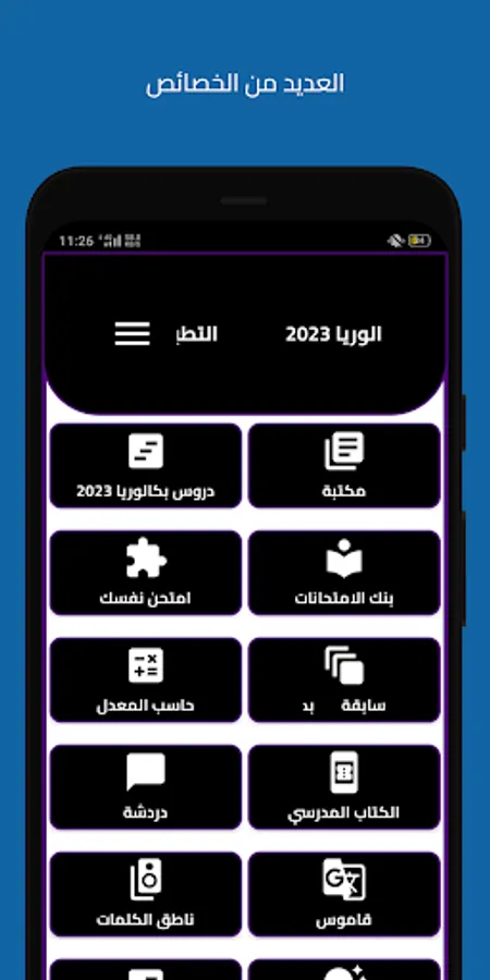 بحيث يحتوي على كل شيء يخص المادة من دروس, ملخصات, قواعد, الكتاب المدرسي, تصحيح الكتاب المدرسي, مصطلحات, فقرات, أسئلة يومية, مترجم, مَصْرِف للأفعال, ناطق الكلمات و الجمل, و المزيد من الخصائص