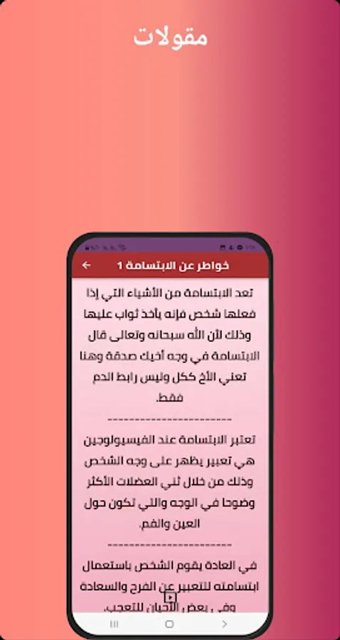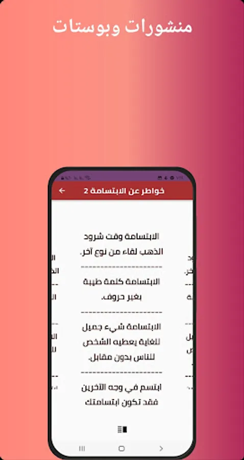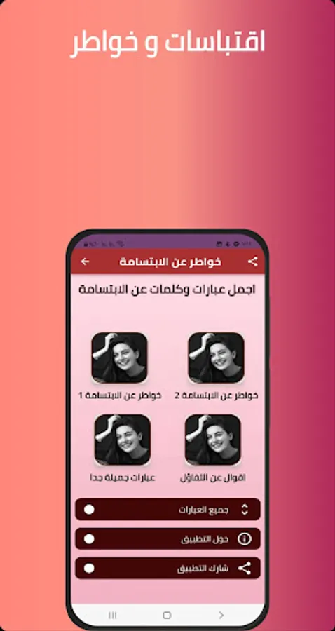 The application of thoughts about smile 2022 offers a large group of sayings, words and phrases about the new and wonderful smile, where you can send it to a lover or a friend easily through the application, a distinguished bouquet of useful sayings and images, influential and expressive sayings, morning and evening sayings, and religious sayings about Ramadan and optimism and Friday night about the smile And many other miscellaneous sections of sad cases about the smile 2022 without the net