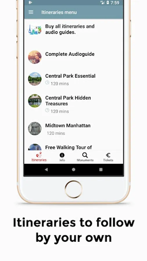 Don't you exactly know how to profit your time? Where to start? We are here to solve that! We propose itineraries by hours, in order to enjoy the place as much as you can! You will feel like on a tour, but on your own and at your own pace. Once you choose one of the itineraries (paying a ridiculous price of less than € 5), you can follow the route and listen to the audio guides, which will give you information to understand what you see once you are in front of it. Or if you prefer, you can read it.