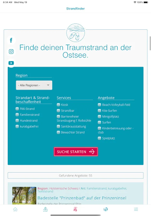 The Baltic Sea app offers you tips on excursions, bike routes and food and drink, an overview of SUP and surf schools as well as information on piers, beach bars and inspiration for a break by the sea - even in winter. In addition, you will find all holiday addresses with the contact details of the local tourist information offices for the Baltic Sea Region of Schleswig-Holstein.