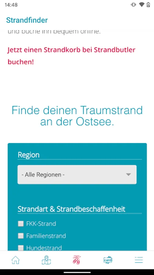 - Nearby: Let us determine your position and see what is on offer around you: parking spaces, beach alternatives and excursion tips, restaurants, sights as well as beaches and beach bars, restaurants, ostseecard partners, SUP schools and much more.