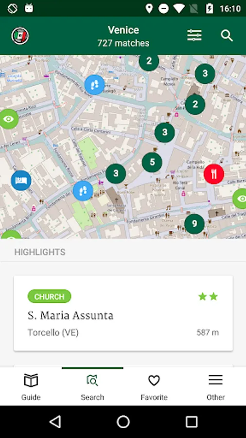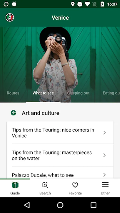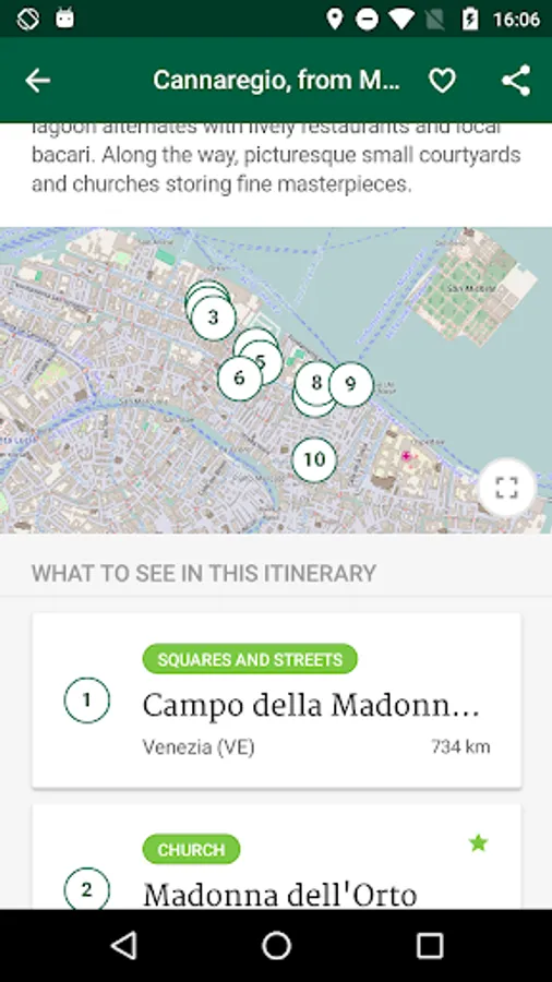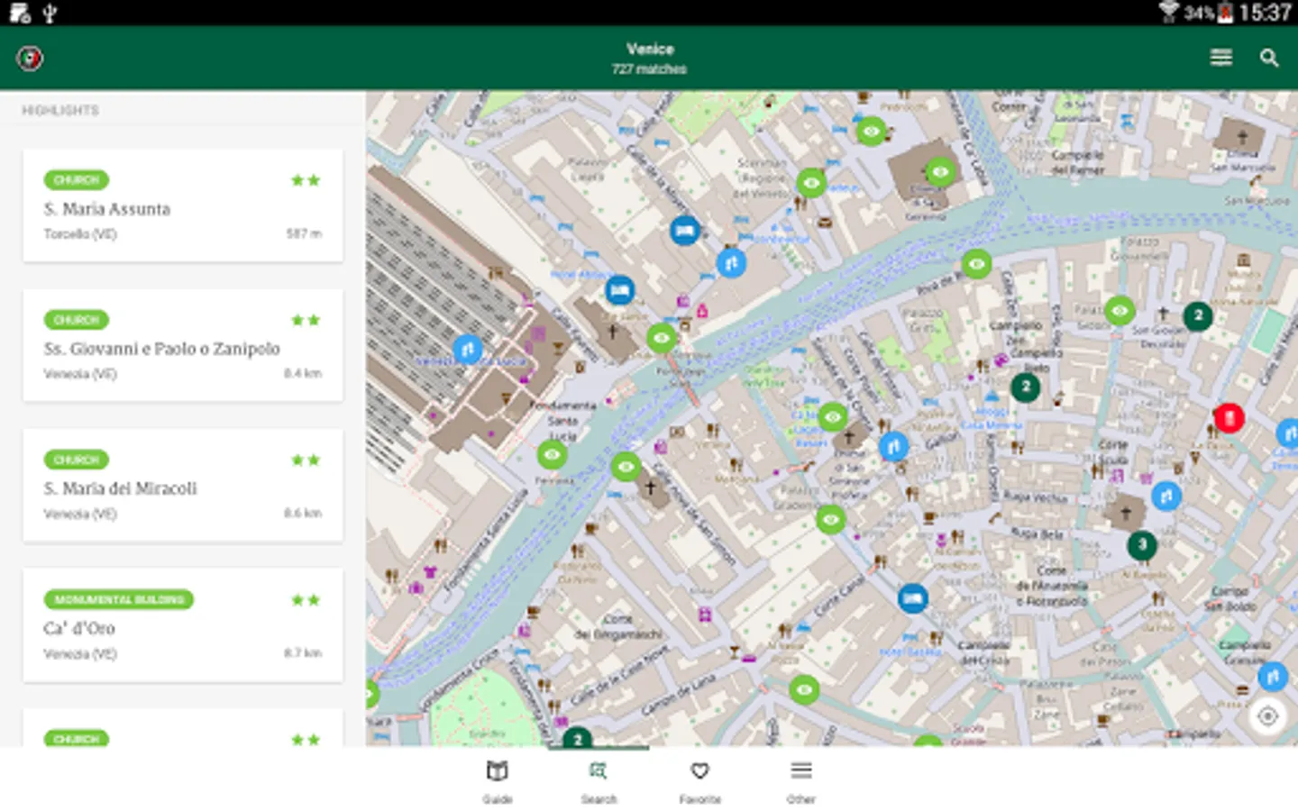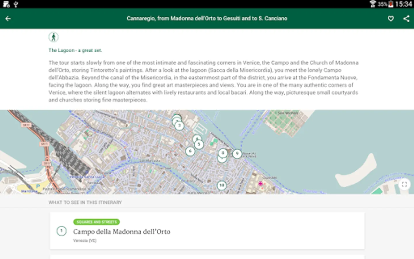 21 tours to discover the city and its territory, palaces, museums, churches, places not to be missed, Palazzo Ducale, Piazza S. Marco, S. Giorgio Maggiore, the Grand Canal, the Rialto Bridge and then again the enchanting islands of glass and lace, Burano, Murano, Torcello, and other small islands of the Lagoon. Each tour with photos, an important selection of points of interest geolocalized on the map