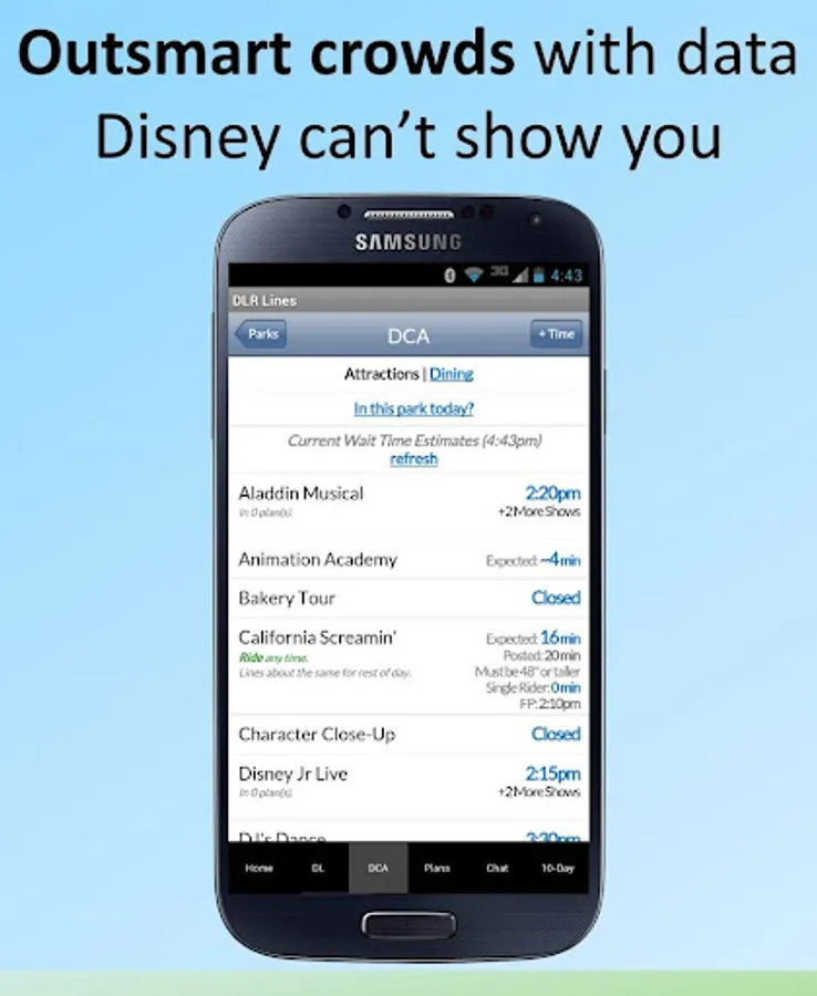 -Customized step-by-step touring plans for both Disneyland and Disney California Adventure. You tell LINES which rides you want to see, and LINES will create a step-by-step itinerary showing when to go to each ride to avoid long lines. You can even change your plans while you’re in the park!