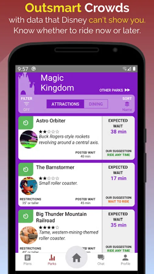 -New “Ride Now” and “Wait to Ride” recommendations to show whether waits are going up or down at your favorite rides.