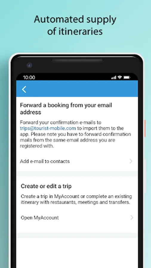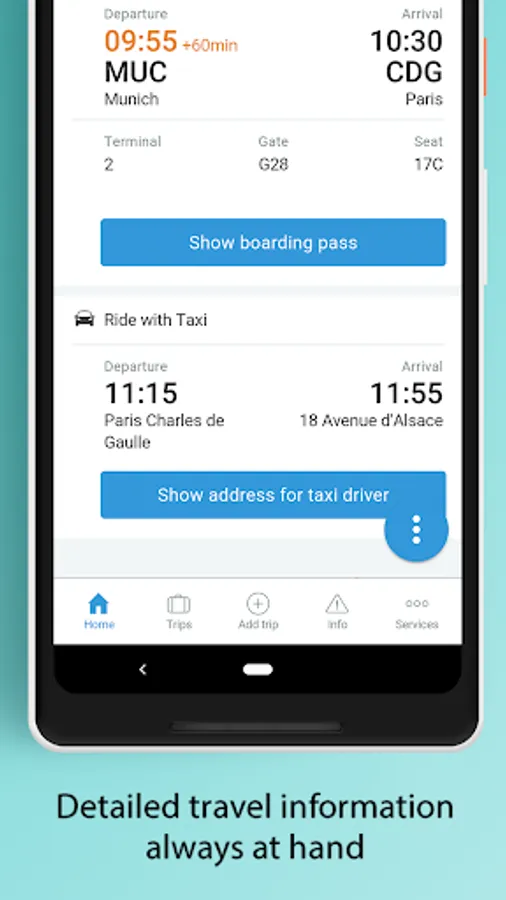 Developed especially for business and frequent travelers and the perfect solution for everyone who likes to have all travel information and services such as online check-in in one app. Send us your booking confirmation via e-mail to trips@tourist-mobile.com and your travel itinerary will be available in the app shortly thereafter!