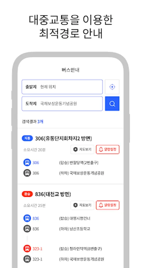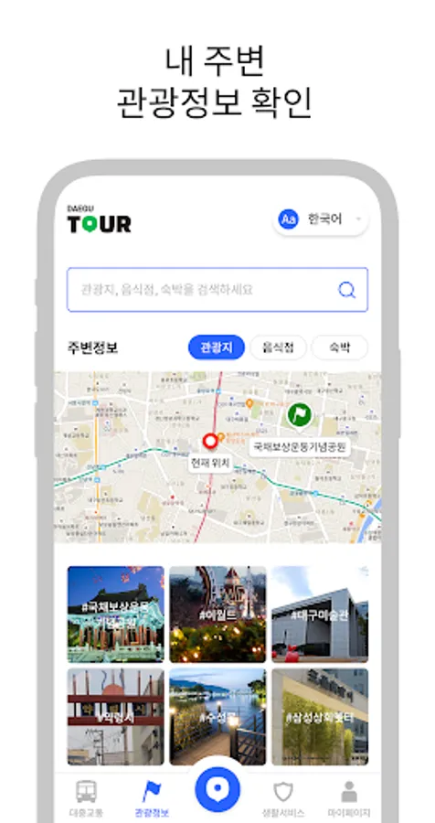 Daegu Tour is a multilingual tourist information service app based on the use of city buses for foreign tourists visiting Daegu and citizens living in Daegu. In order to provide a mobile environment that foreigners can use easily, the service is provided in 6 languages [Korean, English, Chinese (Simplified), Japanese, Vietnamese, Thai)].