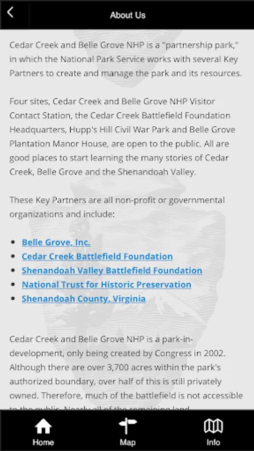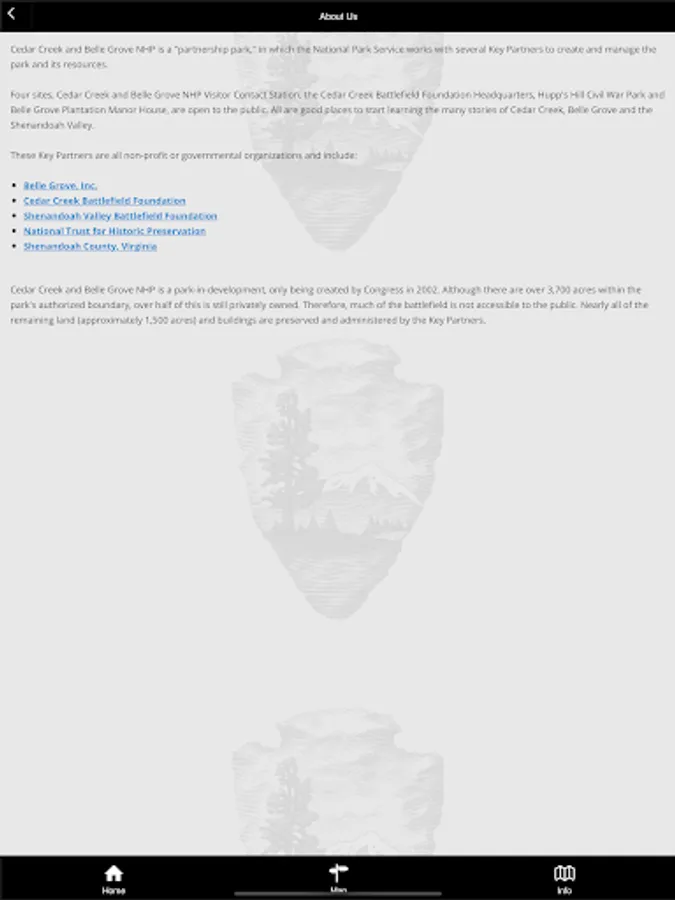 This National Park Service App for Cedar Creek and Belle Grove NHS welcomes you to explore the park to learn about the diverse history of the Shenandoah Valley. This app features a variety of driving and walking tours, with video and audio files. Includes a 17-mle, 9 stop driving tour of the Cedar Creek battlefield. Others sites include Belle Grove Plantation Manor House, the Morning Attack Trails, and many others, along with some of the park’s natural resources. Check back as this app continues to develop and grow.