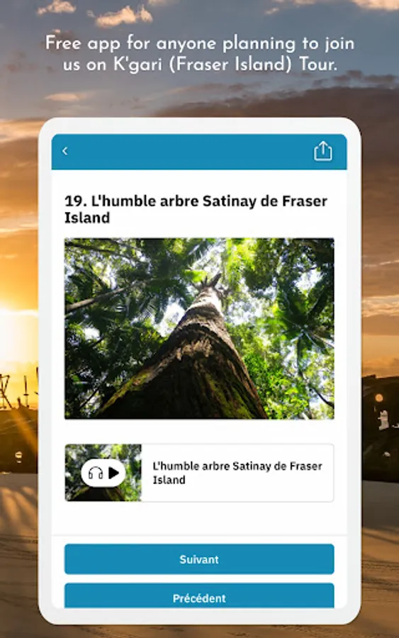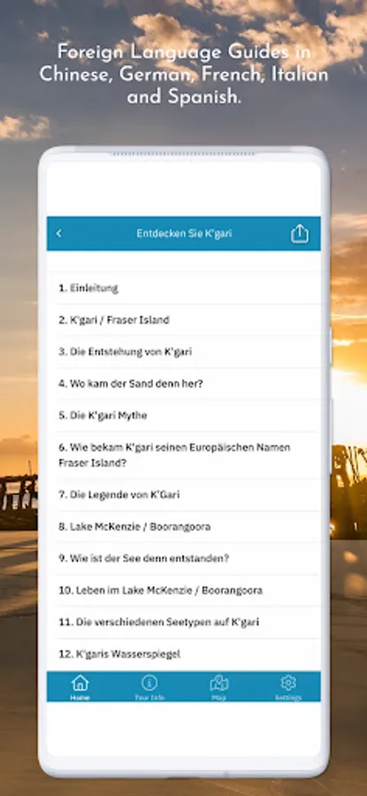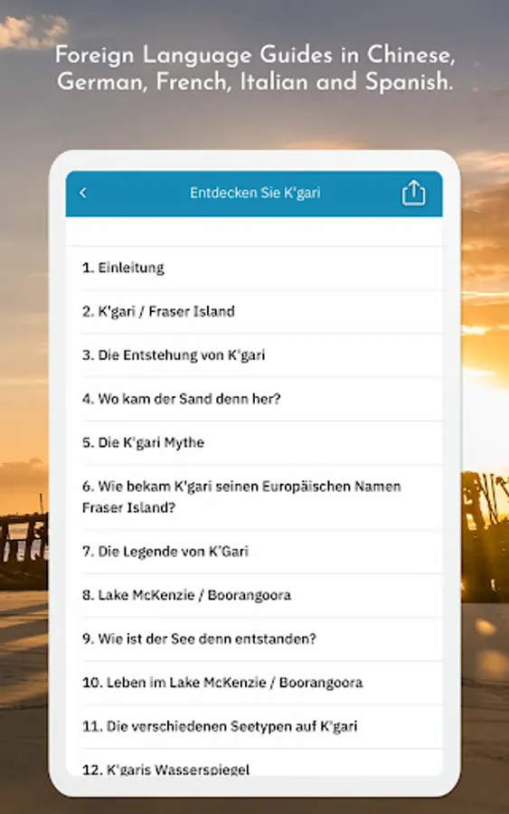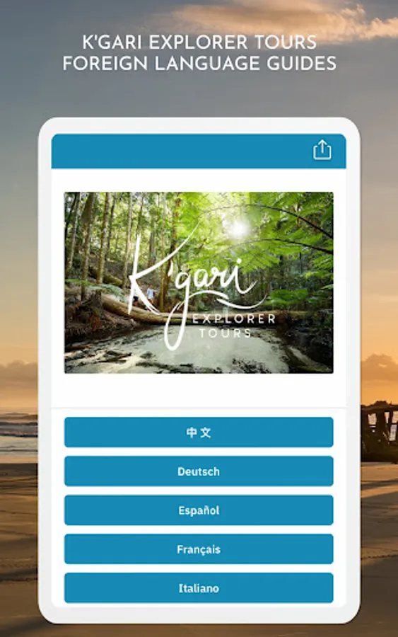 The app will work offline on K'gari (Fraser Island), but content must be first download for offline use. Connectivity on K'gari (Fraser Island) and at our mainland terminal is very limited. We recommend the Foreign Language Guide is downloaded and installed prior to arriving on the island. Once installed open the app before arriving at the mainland terminal to download content for offline use. You must have an internet connection the first time you open the app so you can download the content for offline use.