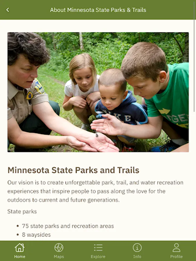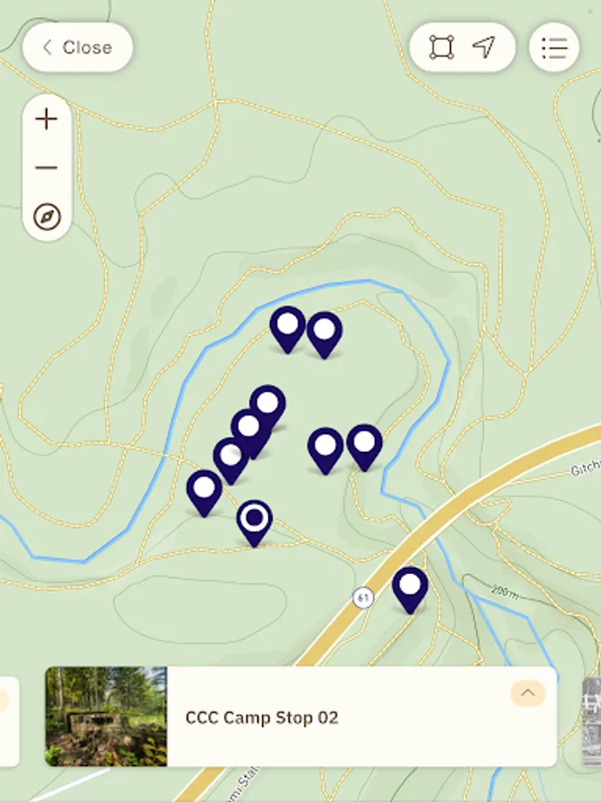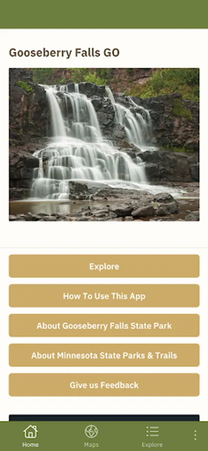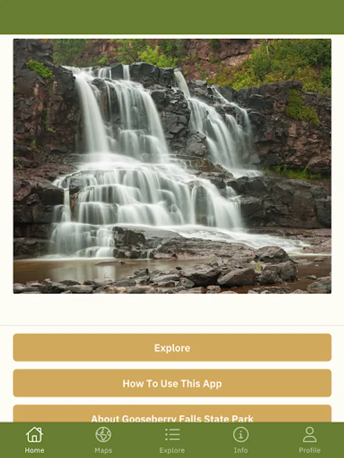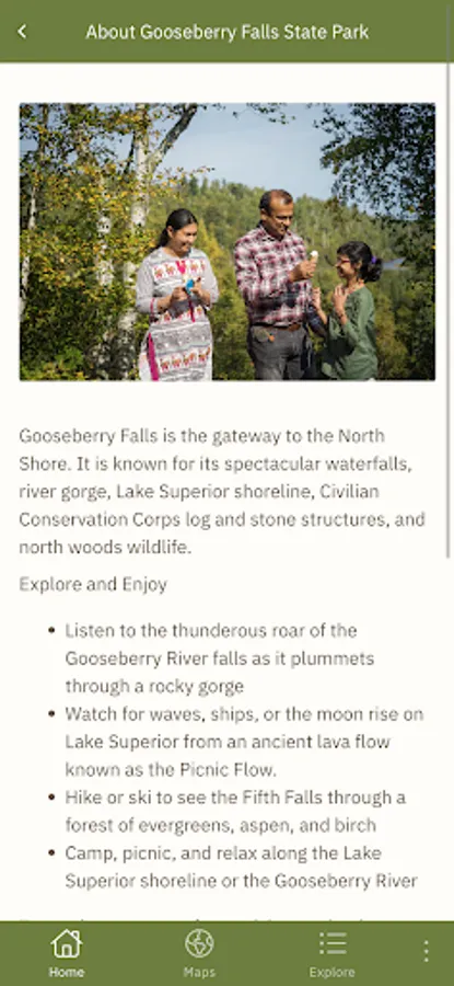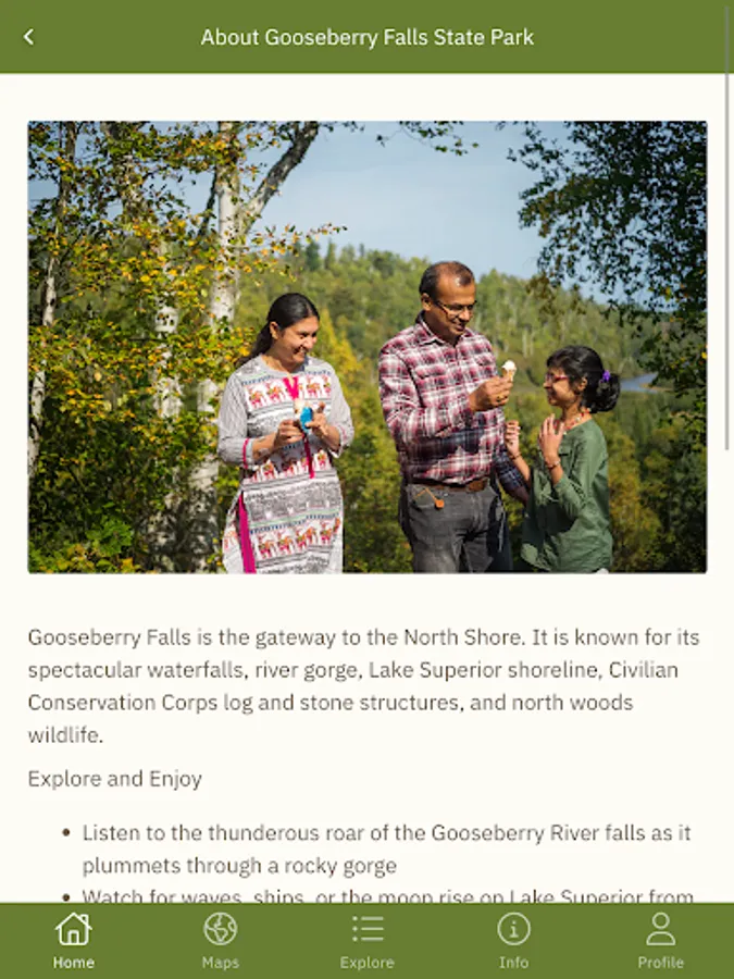 Tour Gooseberry Falls State Park like never before with the Gooseberry Falls Go app. You'll explore multiple scenic routes in the park, go on a photo challenge and learn to identify trees and rocks. Along the way you'll hear the hidden history of the CCC boys who built the state park, discover how those magnificent falls were formed, and dive deeper into the nature that surrounds you. Works offline. Free Wi-Fi available in the Gooseberry Falls Visitor Center for downloading the app.