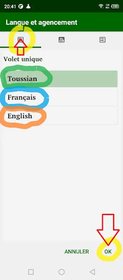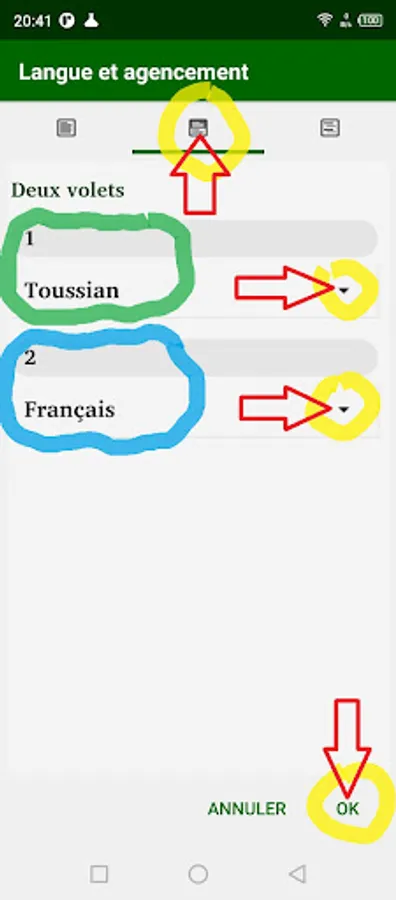 - "two panes" to display the Toussian at the top and the French or English version at the bottom