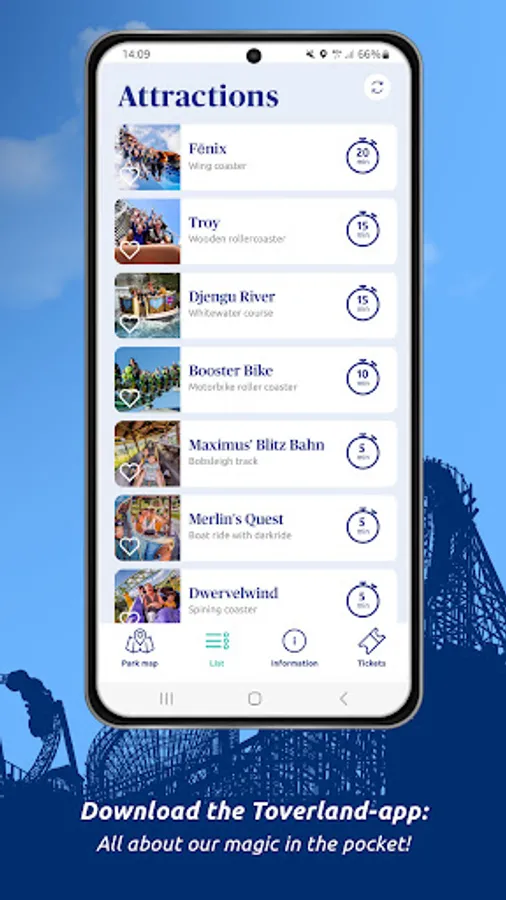 The best way to prepare your visit is with the Toverland app! Find the location of the most exiting attractions or see where you can find the tastiest snacks. Within the app you will find the waiting times for your favourite attractions, which restaurants are open and when the spectacular shows start. This is how you get the most out of your visit!
