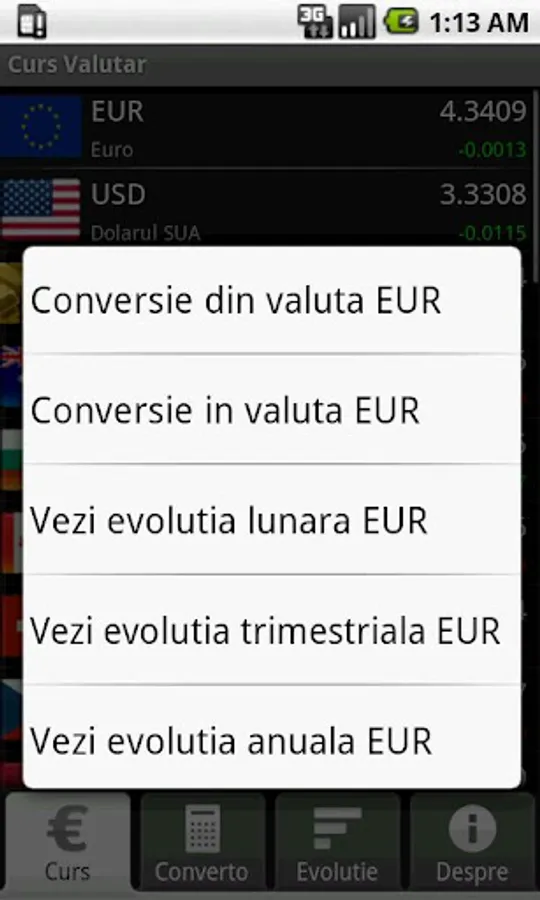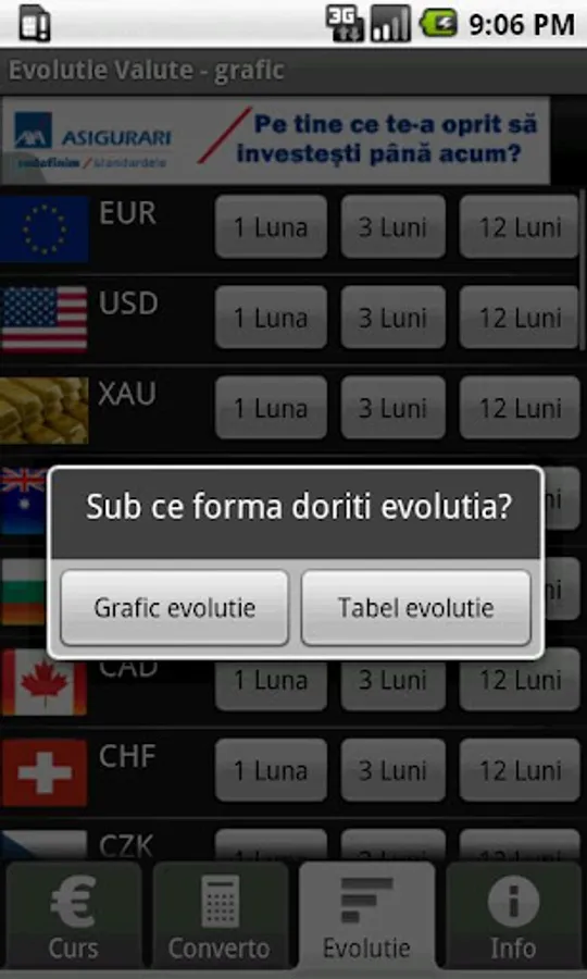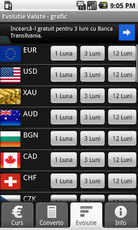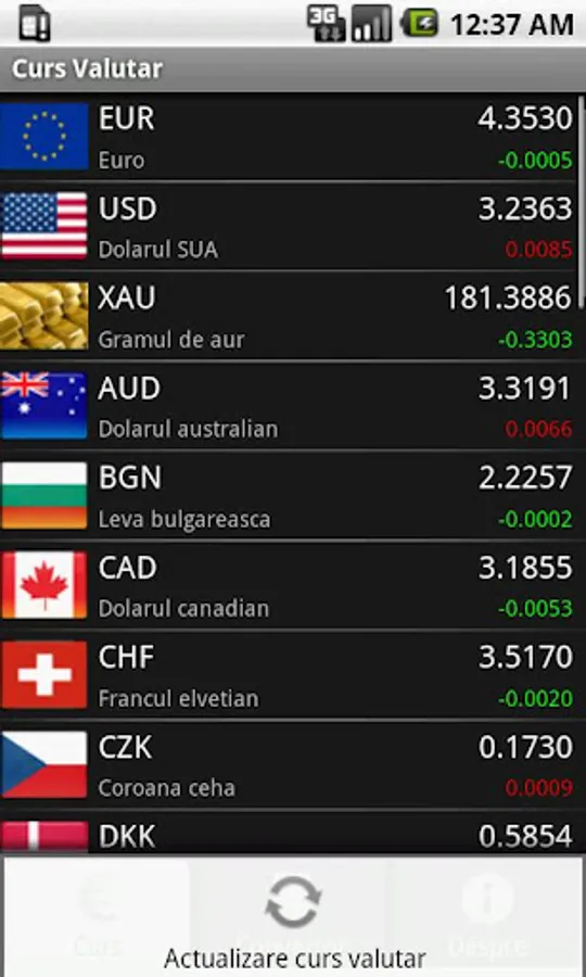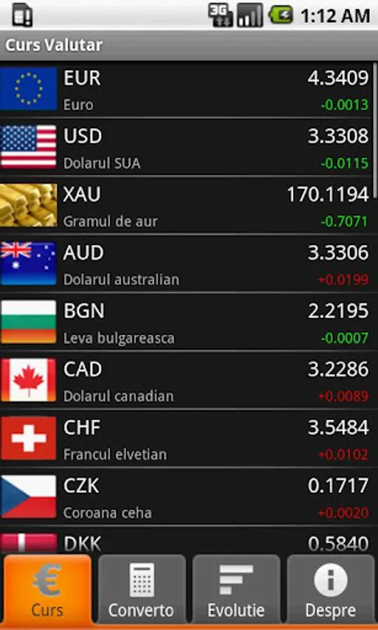 -listarea tuturor valutelor oferite de Banca Nationala a Romaniei si evolutie fata de cotatia precedenta
