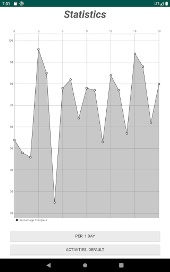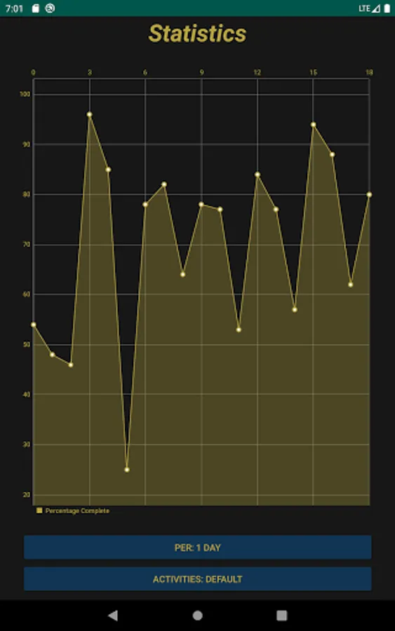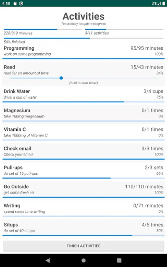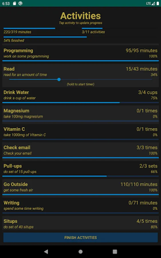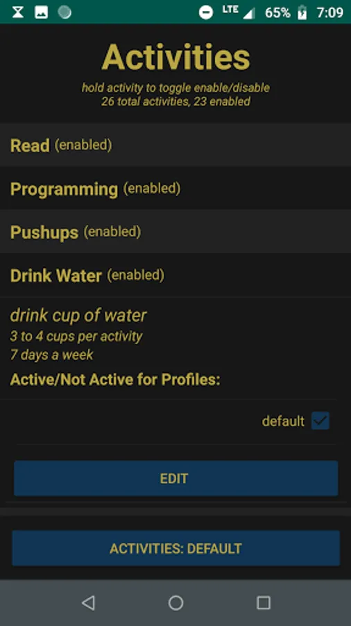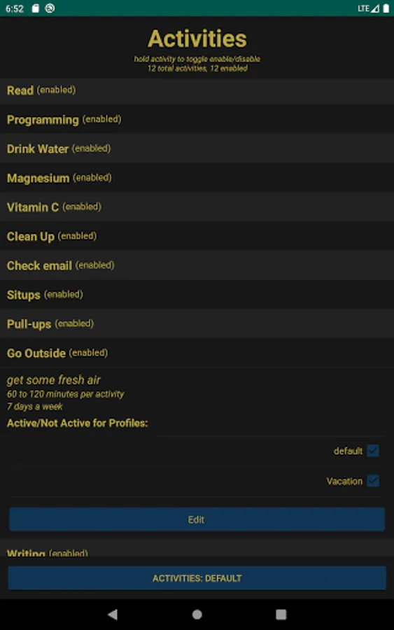 This randomization comes in the form of the user defining how many days on average per week a selected activity will be generated, as well as the range of magnitude of activity. For example, a journaling activity might be created that has the average frequency of 4 days a week and a magnitude range of 20 to 60 minutes. When the journaling activity is chosen to be added to the day's activities, the amount requested to do will be a number randomly selected between 20 and 60 minutes.