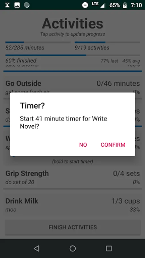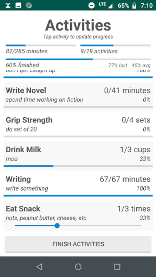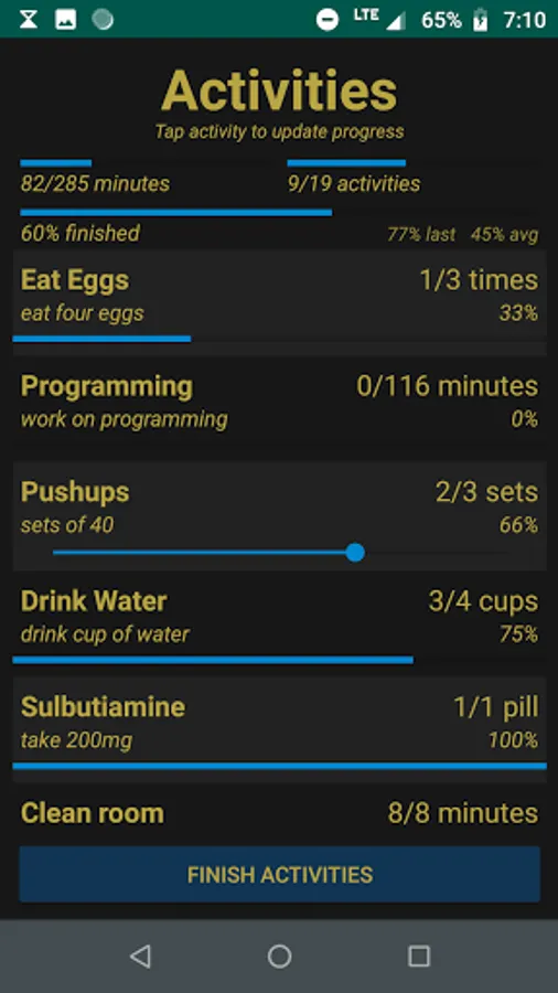In addition to this semi-randomization, RIP enables the user to keep track of their completion rate of each task as well as the composite averages across time, which allows them to better understand how they are spending their time as well as have a metric for which to "beat", which turns the process into a bit of a game.