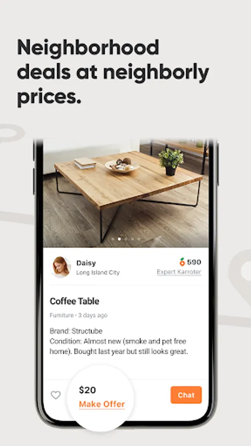 We don’t charge you to use Karrot. What’s more, you could even find free stuff. Pop in to see what’s on offer, you’ll find a range of items, from home decor to baby stuff!