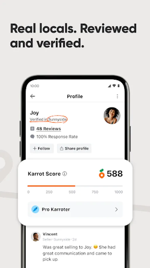 Based on user reviews and feedback, our rating system gives you peace of mind. Each user’s Karrot Rating is shown clearly in their profile.