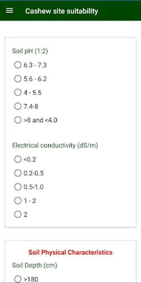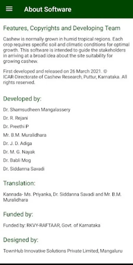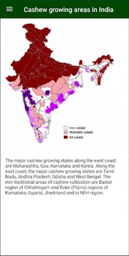Cashew Site Suitability is developed by ICAR-Directorate of Cashew Research, Puttur with funding support of RKVY-RAFTAAR, Government of Karnataka. The app is developed to give a general and broad idea about the site suitability for cultivating cashew. The users need to input various agro-climatic parameters of their site.