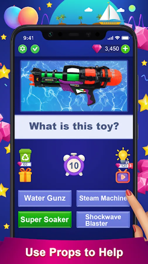 🏈 Use "Light" to remove a wrong answer; Use "Diamonds" to buy 20 seconds more if your time is used up.