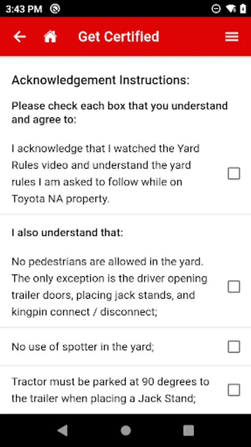 The TSCS Driver application allows the driver to confirm their shipment pickups and automatically communicate the pickups with Toyota. It also includes a one stop shop for safety that are required to be reviewed before accessing Toyota’s yard.