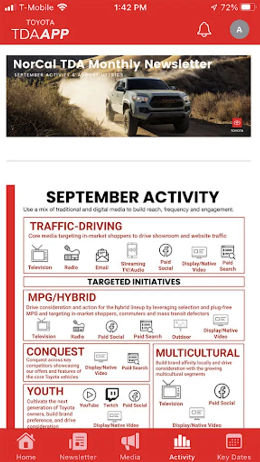 Authorized users (Toyota Dealership Association members) receive timely and relevant communications on a real-time basis. Get notifications, newsletters, activity and metrics data, and key calendar dates all in one convenient location: your phone.