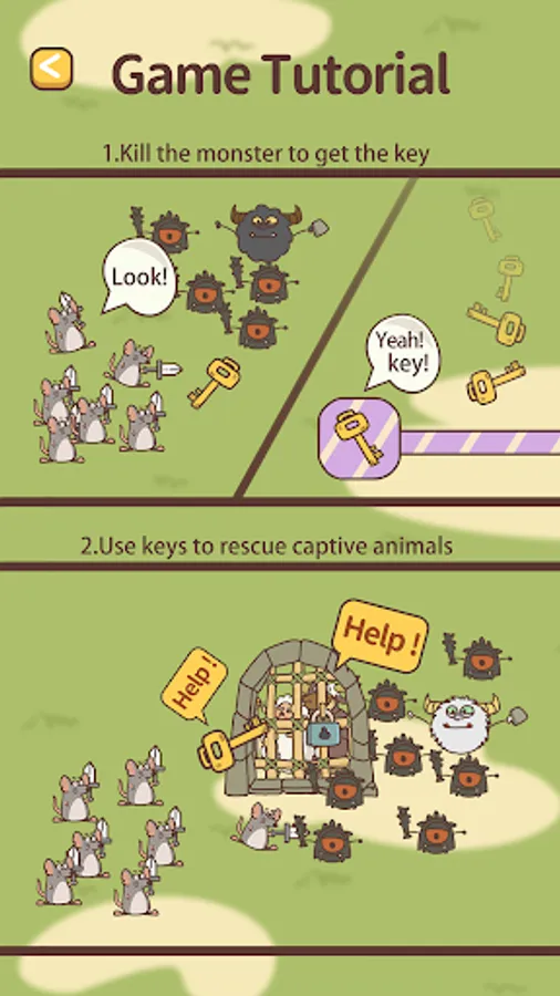 Small animals have been kidnapped by monsters. You can move your soldiers, kill monsters and obtain keys. It takes a key to open the prison and save more friendly troops. In addition, you can get extra gold coins by collecting letters. Before entering the game, you can unlock and buy upgraded minions and heroes. The more minions you bring, you can win higher scores.