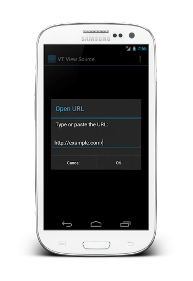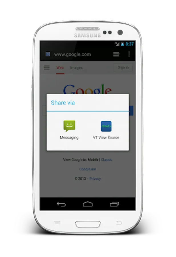 Option 1: Browse for the webpage in your favorite phone browser, then select "Share page" command from your browser's menu and tap on "VT View Source" in the list of applications you can share the link with.