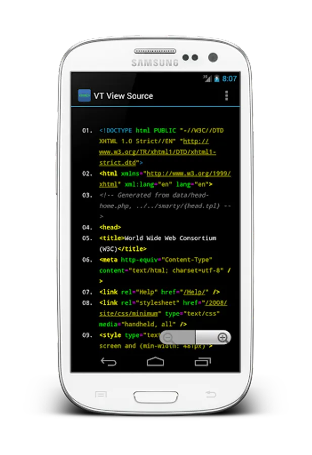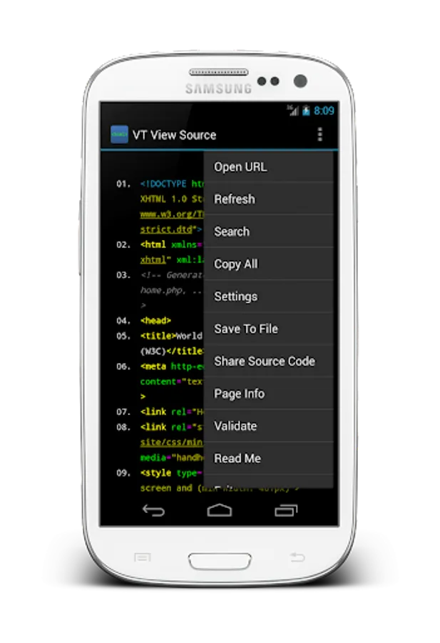 The source code can be opened by typing the URL address or using "Share page" functionality of device browser (native Android browser, Opera Mobile, Dolphin, Chrome, Firefox, etc.).