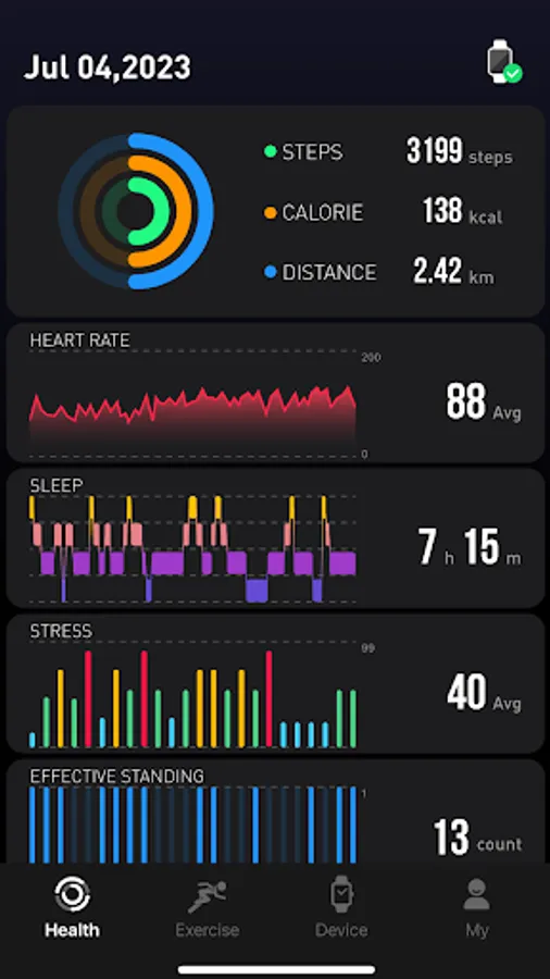 2.Synchronize the number of steps, calories, walking distance, activity time, and effective standing times recorded on the watch.
