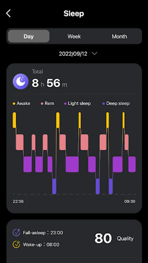 The APP keeps records in sleep monitoring through smart watch; divides different sleep stages; evaluates sleep quality; heart rate monitoring, all-day pressure monitoring.