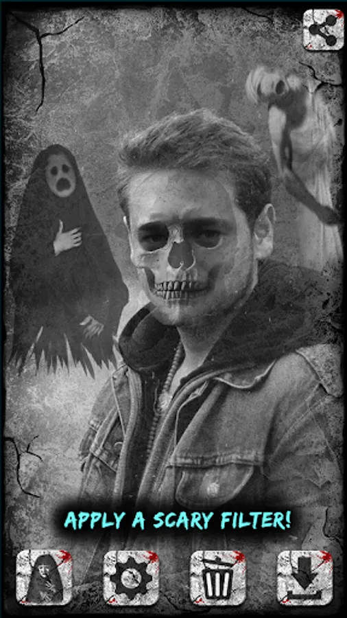 You like scary camera pranks? Perfect, because only brave ones can handle this picture editor with horror stickers for pictures. Choose from a wide selection of ghosts in your photos that are available in this creepy background photo editor and apply horror filters for pictures. You will laugh so hard when you make picture creepy and frighten your friends with this “ghost prank camera app”. Congrats, you found the best ghosts effect for photos app with horror stickers camera that looks real. So, hurry up, and try Ghost Camera Prank Maker with scary picture tools and realistic spooky stickers for photos that will send shivers down your spine!