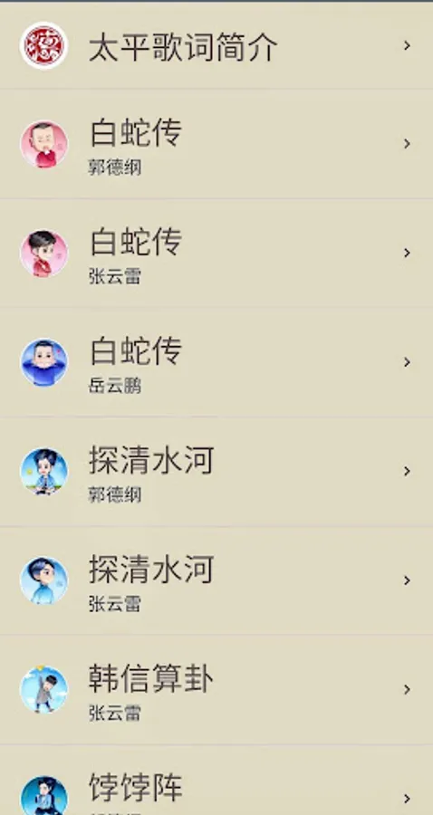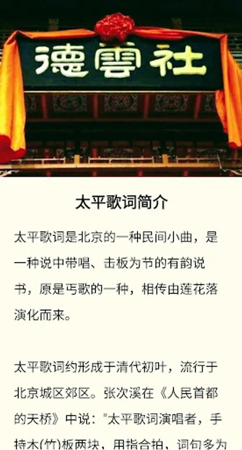 Taipinggeci collection (太平歌词)是一种从属于相声的曲艺形式,约形成于清代初叶,从北京的民间小曲演变而来,一直被作为相声的四门基本功之一,德云社的火爆进一步推动了太平歌词的发展。除此之外应用户要求,还有一些其他的传统曲艺。