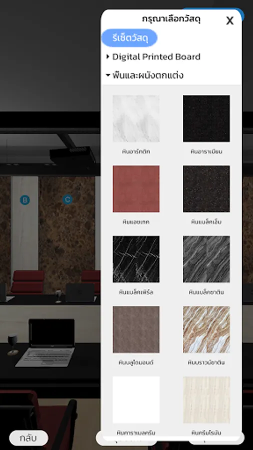 TPI 3D demonstrates all Fiber Cement products that TPI has in different rooms such as Bathroom, Bedroom, Dining Room, Living Room, Meeting Room, and Kitchen. This application will represent how different textures are like in each surface area of the rooms, no matter it is Marble, Mahogany, or personalized photos.
