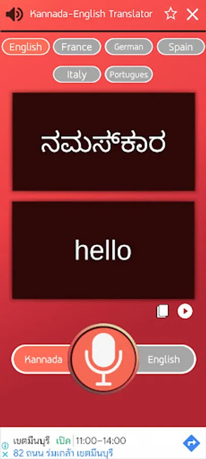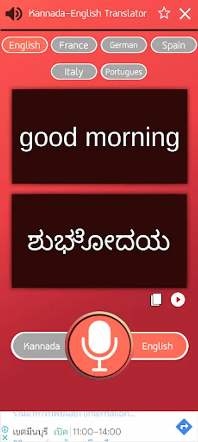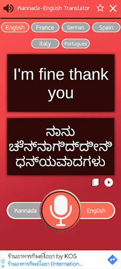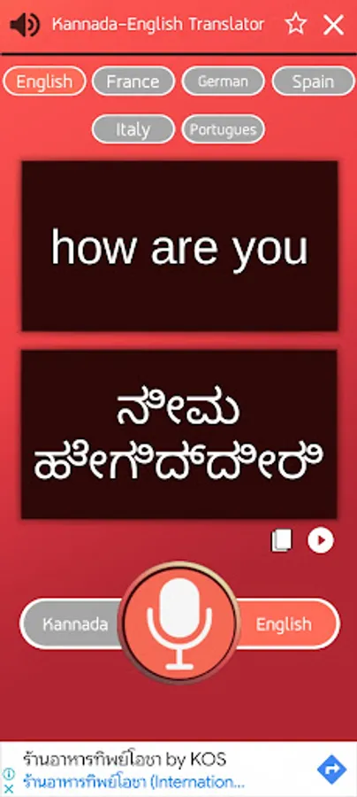 Translate Kannada to English, France, German, Italy and Spain by voice.