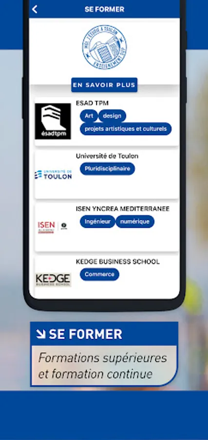 The “Training” section lists higher education establishments in metropolitan France: referral to websites, social networks, email and telephone contacts.