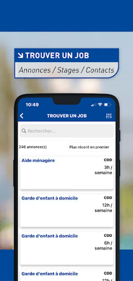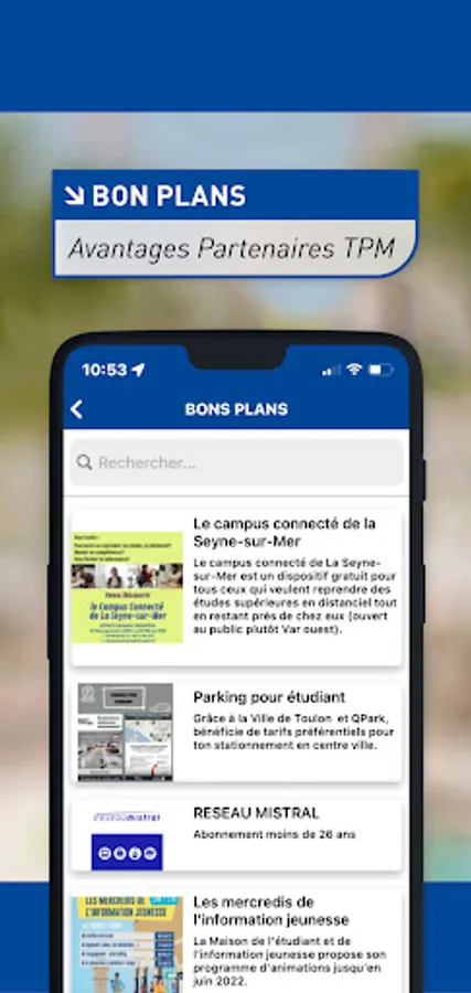 The "Find a job" section allows you to consult job offers intended mainly for young people and students and from the offers of the Maison de l'Etudiant and Youth Information of the City of Toulon and the "Jobaviz" platform. . After a presentation of the job offer, it is possible to apply. After identification by surname, first name, email, telephone (optional), INE number, submission of CV and cover letter (optional), an email is sent to the Maison de l'Etudiant et de l'Information Jeunesse or the "Jobaviz" platform for examination and treatment.