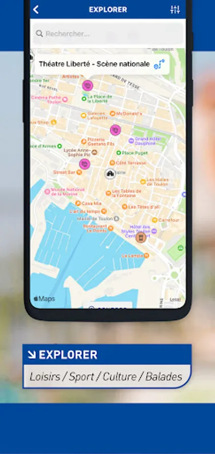 The “Explore” section allows you to find points of interest in the Toulon Provence Méditerranée metropolis on the map.