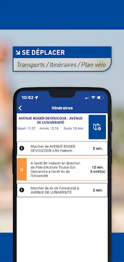 The travel module allows you to define a starting point and an ending point in order to calculate a bus, boat-bus, bicycle or pedestrian route, at the chosen times.