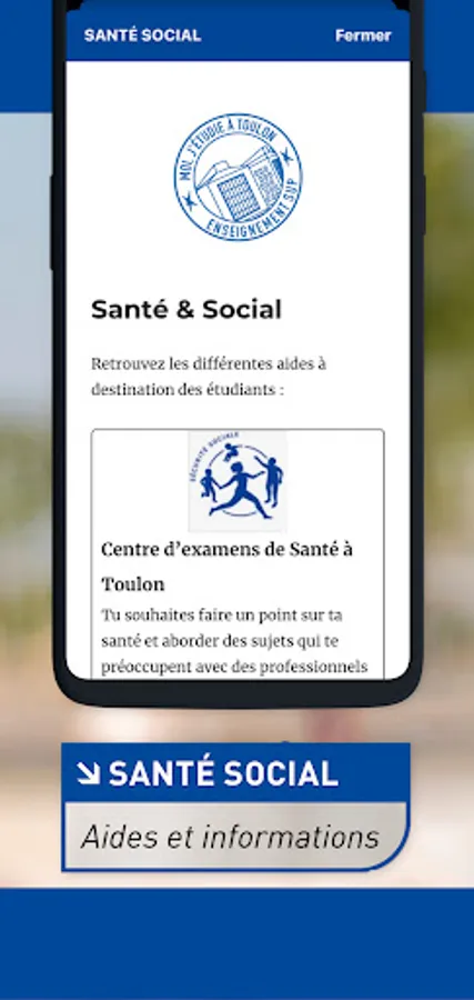 The "Health - social" section allows you to consult information relating to social and health aid intended for students: referral to dedicated websites such as the CROUS, the Ministry of Higher Education and Research, the Provence Alpes Côtes d'Azur Region. 'Azur, the Toulon Provence Méditerranée Metropolis, the Student and Youth Information Centre, etc. and information entered by TPM.