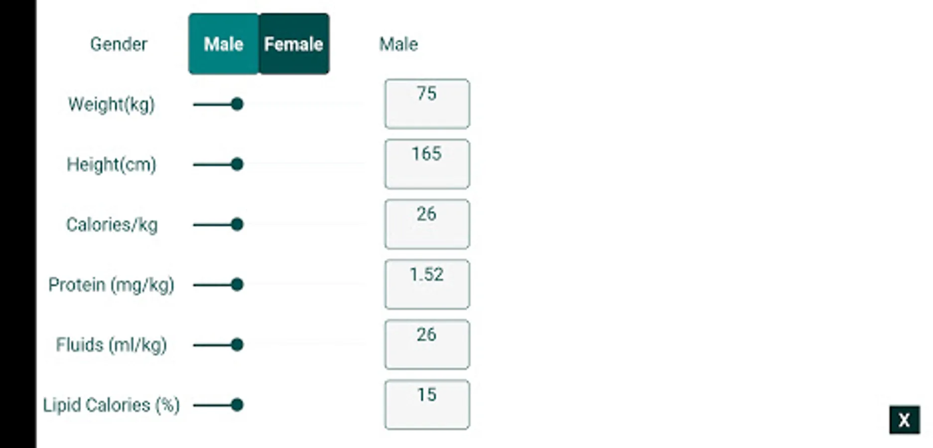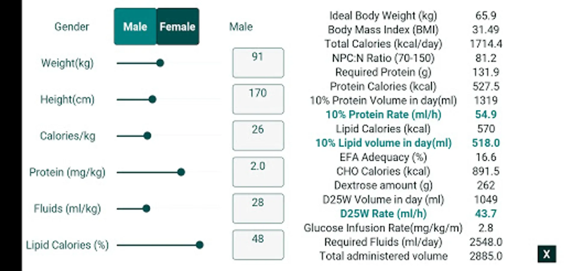 A simple interactive calculator used for calculating ideal body weight, required total caloric intake, non-protein calories to nitrogen ratio , Glucose Infusion Rate , IV fluid rates and others within seconds