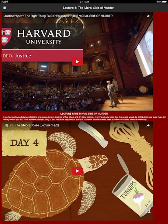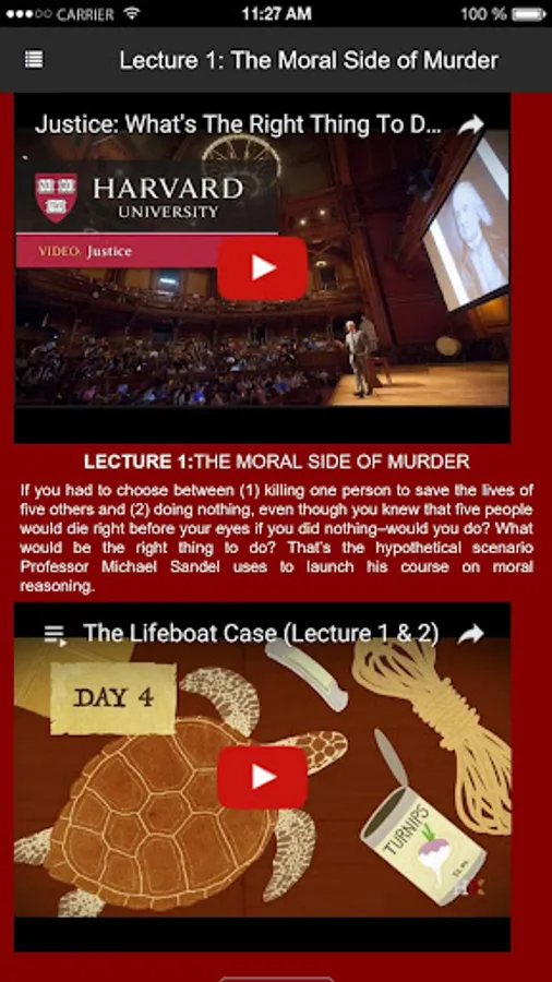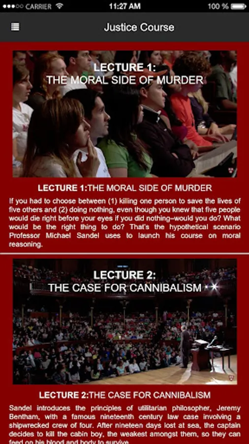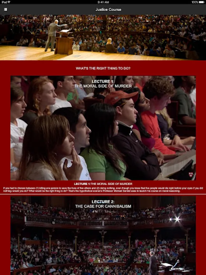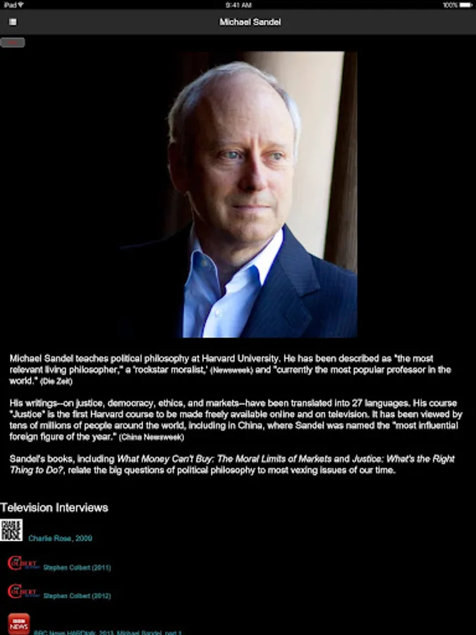 Watch Michael Sandel's legendary Harvard course "Justice" and related videos on democracy and the ethical dilemmas we confront in our everyday lives. With lively discussions of the biggest civic questions of our time, the Justice app is a resource for learners of all ages, and for citizens in search of a richer public debate.