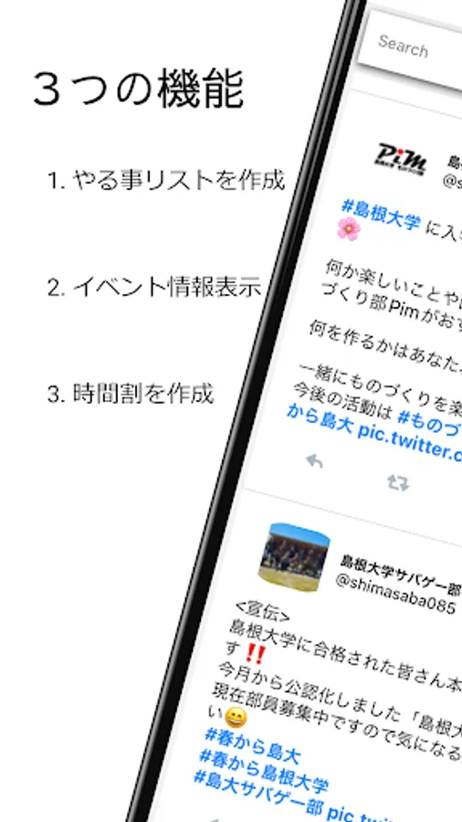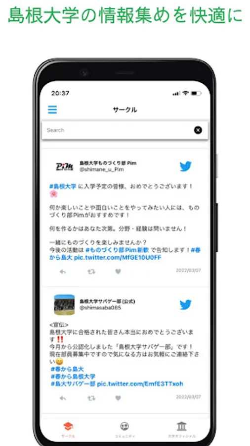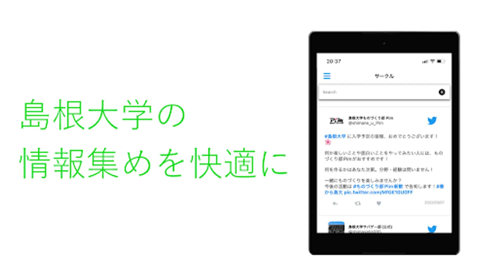 This application extracts and displays only useful information for Shimane University students, such as event information, from tweets on the official Twitter account about Shimane University.