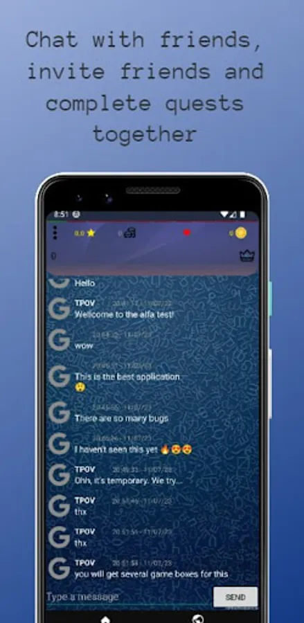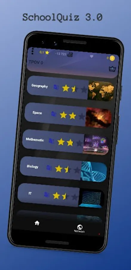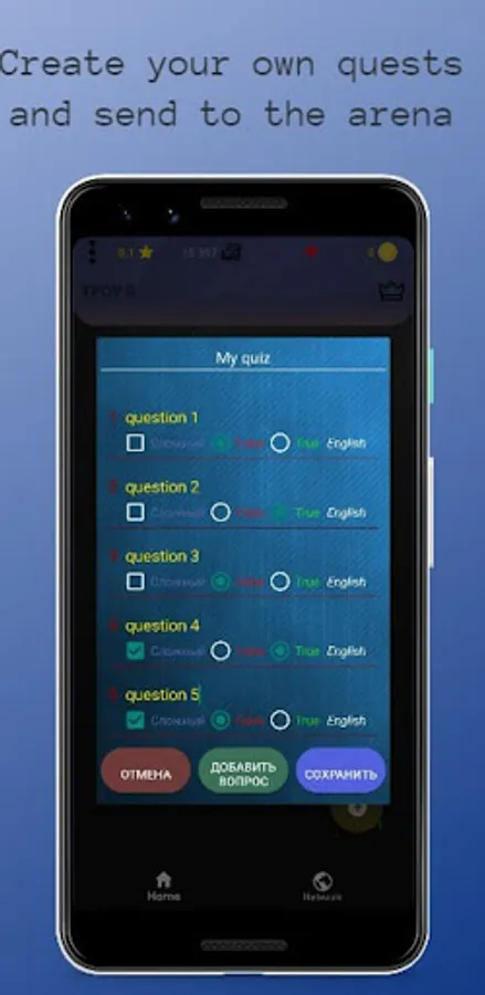 The stars show the best result. Date - this is the date the quest was created, the name of the best result is displayed above the date, if it was specified. # New quiz When you try to create your own question, you will be prevented by a dialog box in which you must specify the name of the quest, then you specify the question itself, the answer to it, the difficulty and the "Next" button, and also fill in the next question, etc. until you get bored, then press End. Note that end also writes a question. # Timer Has a complex logic, if a question with an answer is displayed when the application starts - the timer does not start, if you rewind the questions back and a question opens without an answer - the timer starts, with further rewinding of the questions - the timer continues counting even if you are on the question with the answer, while you will not answer any of the questions or the timer will not end. If the timer ends - it answers the current question randomly, if you are on a question with an answer - it answers the last viewed question without an answer. As a rule, the timer starts if you read a question without an answer. # Question of the Day Represents the question of the day that is displayed on the launch screen with the answer. When you start the application from the server, as many questions as you like are downloaded - as many as you need so that there are 10 pieces, but only one is displayed, the rest are displayed when there is no Internet, that is, 10 days without the Internet, you enjoy the questions on the start screen. How many questions-days are left is displayed on the main screen as red or green squares. Questions are currently only available in English. Server - API JService category - 1# The loading screen is accompanied by an animation of the letters "TPOV" and the question of the day. It automatically closes after the animation completes. # Music plays when completing any quest. Music from the old hangar from the game World of Tanks #Animation When measuring the quest for the next one. or earlier. question, as well as on the start screen. In the future, various school questions and new features will be added. You can also share your questions in the review, the best questions will probably be added to the app. And also, you can support the author with a rating of 5, or remove ads, and everything will be right for you ^)