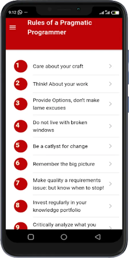 Programming is a craft, a skill, like painting, and programmers are artists whose paints are texts(syntax). Like every other craft, there are tools, best practices, ethics, etc... to achieve minimum output and maximum creativity. This app gives your the very rules to be a pragmatic programmer, and improve the productivity of your team, or your individual productivity. The App is based on the 1999 book by Andrew Haunt, The Pragmatic Programmer.