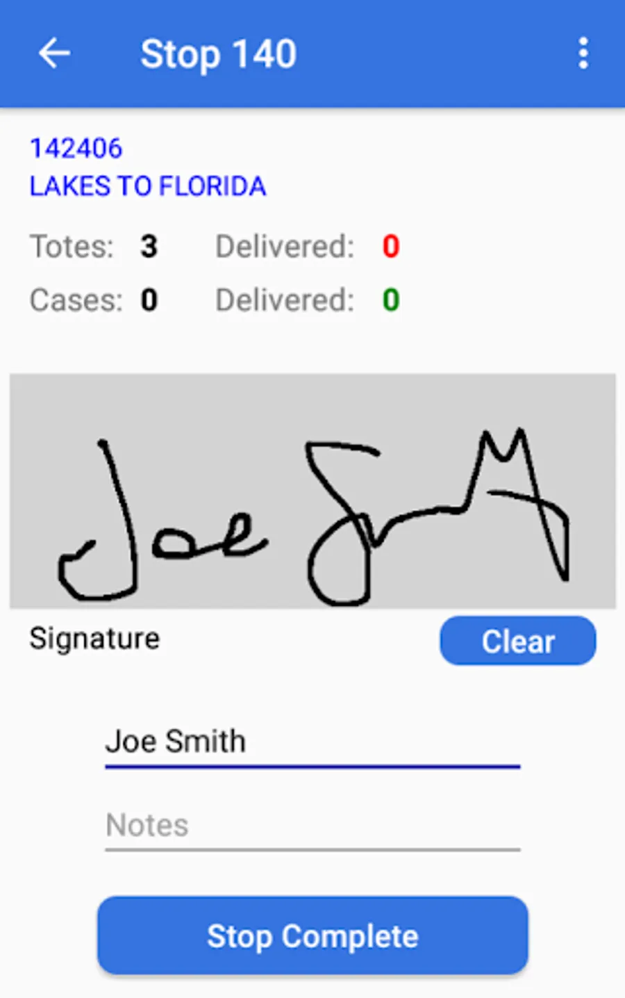 TurningPoint customer route/stop delivery driver app. Get signature(s) at drop off. Proof of delivery.