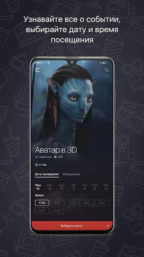 Ability to choose a place. The ability to independently choose the date, time (for events that are held more than once) and the place of boarding for events (the layout of the hall is available for viewing).
