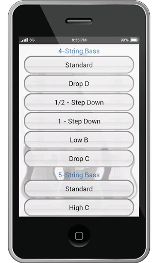 Bass Guitar Tunings is simple and easy to use bass tuner app, for Smartphones & Tablets. Bass guitar tunings includes Standard Tunings for 4, 5, and 6-string bass, with 12 alternate tunings. Good quality sounds. Useful tool specially when restringing your guitar, and need to find your tune again.