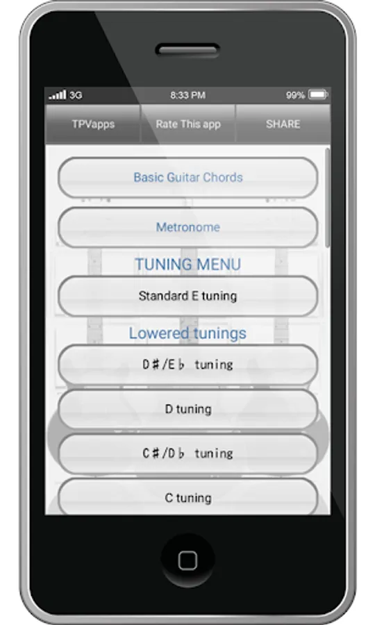 Guitar tunings plus is simple and easy to use guitar tuner app, for Android smartphones & tablets. Guitar Tunings Plus include Standard Tuning (E), and 32 alternate tunings, including lowered tunings, open tunings, dropped tunings, regular tunings and, Instrumental tunings. High quality Audio.