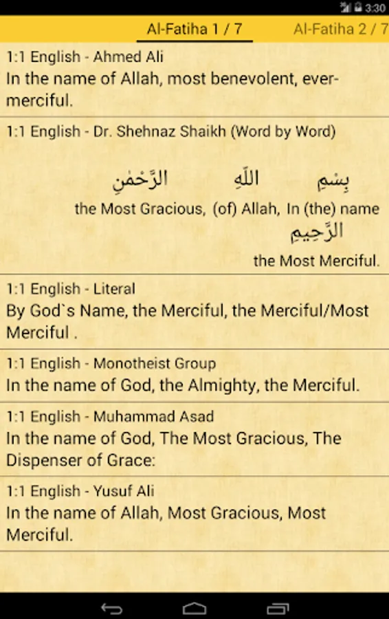 Quran Translations is a free(without banners), simple and user friendly Quran application for Android devices. You can download translations in your language and understand the meaning of holy Quran by comparing these translations.