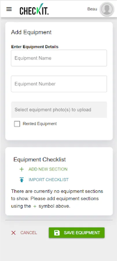 Add Custom Equipment:The "Add Equipment" section of CheckIt makes it easy to add new equipment to your inventory. Simply enter the equipment details, including the name, model number, and upload a photo for easy identification. You can also add any additional notes or details about the equipment, such as specific maintenance requirements and a custom operations checklist.
